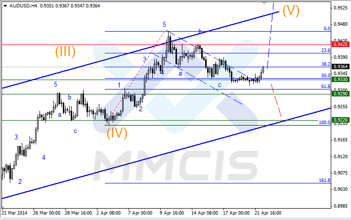В начале сегодняшней европейской сессии пара аусси/доллар начала уверенно расти от уровня поддержки 0.9330. Напомним, что данный уровень также является значением 50% Фибоначчи от всего апрельского роста, поэтому выступает психологической поддержкой. Таким образом, бычий тренд остается в силе, и мы рассматриваем продолжение реализации волны (V).