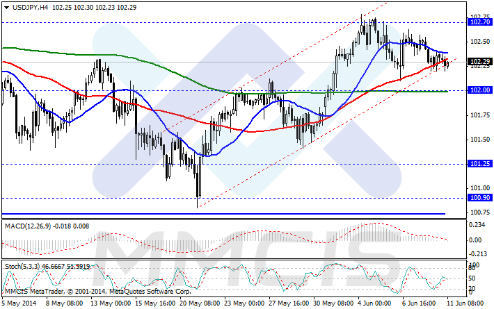 Пара доллар/иена консолидируется у основания 102-й фигуры, существенно снизив амплитуду движения. Пробой вниз сформировавшегося уровня поддержки 102.20 откроет слишком короткую цель до 102.00. Отмеченный диапазон рассматриваем в качестве области поддержки, так как скользящие средние по-прежнему указывают на восходящий потенциал пары. Котировки пары продолжают тестировать на прочность нижнюю границу восходящего канала, проходящую вблизи отмеченной области поддержки. Отскок от текущих минимумов откроет путь к отметке 103.00 и выше, к верхней границе канала в область 104-й фигуры.