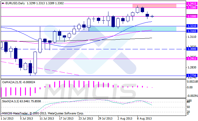 Пара евро/доллар продолжает балансировать на отметке 1.33. Прорыв ниже этого уровня может усилить «медвежьи» настроения трейдеров. Локальной поддержкой для пары служит 20-дневная средняя, текущее значение которой 1.3254. Область ключевой поддержки ограничена уровнями 1.3165-1.3210. В качестве ключевого сопротивления выступает область 1.3380-1.3415.